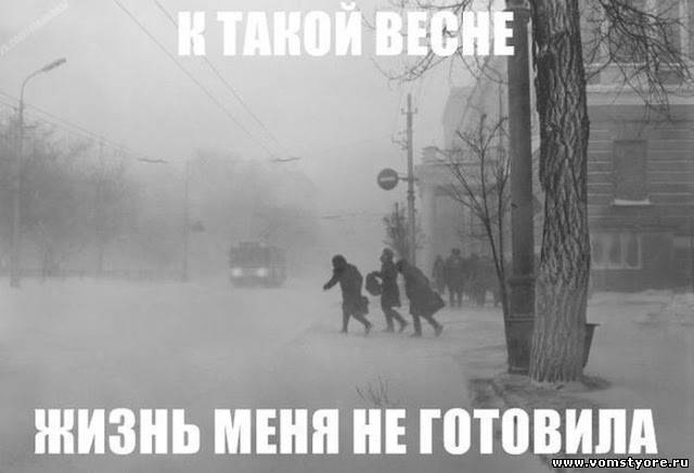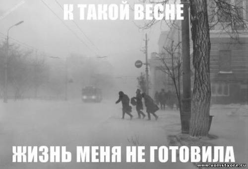 | Погодка - ужас! Сегодня ветер с ног валит и снег. Опять всю улицу занесло. Радует то что все это неспроста. Зима недаром злится, прошла ее пора! А весна придет! Опаздывает только.
