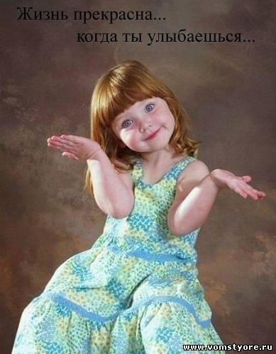 УЛЫБНИСЬ, если дождь за окном не кончается. УЛЫБНИСЬ, если что-то не получается. УЛЫБНИСЬ, если счастье за тучами спряталось. УЛЫБНИСЬ, если даже душа поцарапалась. УЛЫБНИСЬ, и увидишь, тогда все изменится. УЛЫБНИСЬ, и дождь пройдет, и земля в зелень оденется. УЛЫБНИСЬ, и печаль стороной пройдет. УЛЫБНИСЬ, и душа расцветёт.