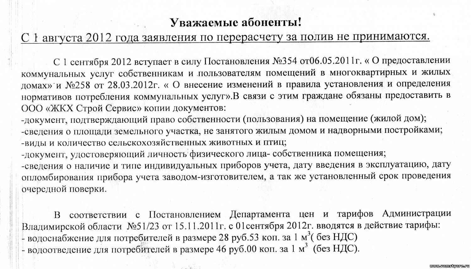 С 1 августа 2012 года заявления по перерасчёту за полив не принимаются.
