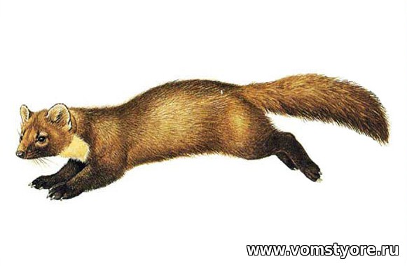 ЛЕСНАЯ КУНИЦА (Martes martes), хищник семейства куньих. Описание: внешний вид - длинное туловище, короткие цепкие лапы, пушистый хвост, заострённая мордочка, широко расставленные уши; волосяной покров пышный, мягкий и шелковистый; куница крупнее большинства соболей, но ступни лап у нее опушены слабее, поэтому след меньше; размер – чуть крупнее домашней кошки, длина тела самца около 50 см, хвост 30-35 см; окрас – темно-бурый с желтым или светло-серым подшерстком; ярко выражено горловое пятно светло-желтого или оранжево-желтого цвета; продолжительность жизни – в неволе живет до 15 лет.