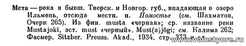 Гидроним «Мста» восходит к финскому «musta» - «черная» (см. М. Фасмер. Этимологический словарь русского языка. М., 1967, т. 2, стр. 668)»