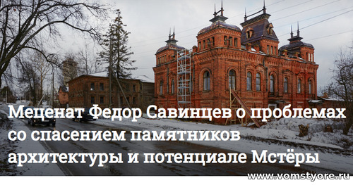Недавно популярный культурный блогер Никита Тау приехал в поселок Мстёра — красивый, но, увы, полный руин. Собственно, последние и заинтересовали инфлюенсера. А точнее, проект столичного филантропа Федора Савинцева, восстанавливающего комплекс зданий конца XIX — начала XX века, в том числе знаменитый дом Крестьянинова на улице Ленинградской. Неравнодушный житель Москвы мечтает превратить его в общественное пространство, но до осуществления этих планов пока еще очень далеко.