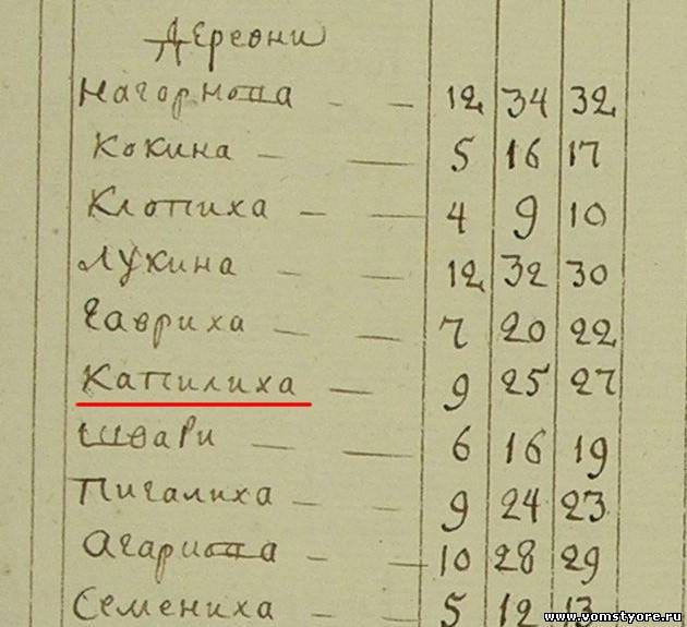 | Всем доброго времени суток.Ищу одну старенькую деревеньку,точней уже урочие.В списках"населенных пунктов ПГМ"конец 18века между бывшими деревнями Гавриха и Швари обозначена д.Капилиха в 9 дворов(по тем годам нормальная деревня),на карте тех годов этой деревни необозначено.Может кто то,где то встречал такое название в наших краях.