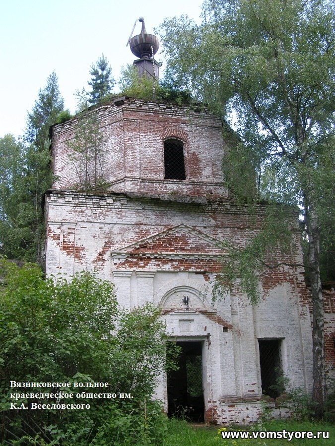 Стоящая на краю высокого склона над долиной ныне высохшей речки, церковь скрыта окружающим её лесом, подступившим к храмовым стенам. Можно пройти совсем рядом и не заметить её. Впрочем, храм, закрытый в 1930-е годы, уже трудно назвать церковью. До основания разобраны ограда и колокольня, крыша рушится. Роспись осталась только в холодной церкви, да и то едва различимая. От деревянного иконостаса уцелели только верхние ярусы со следами потухшей позолоты. Неокрашенные участки на стенах характерной формы и кованые крюки над ними указывают на большие образа, утерянные при разорении церкви. Кафельная плитка выворочена из пола. Сопоставив уцелевшие кусочки можно прочесть надпись: "Харьковъ-Бергенгеймъ" – продукция крупнейшего завода керамических и терракотовых изделий барона Эдуарда Бергенгейма поставлялась в том числе и во Владимирскую губернию.