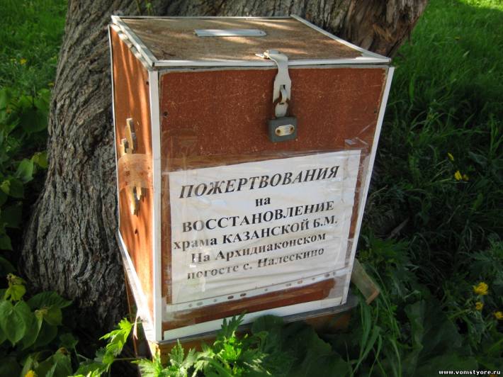 Ящик для сбора пожертвований на восстановление храма Казанской Божьей Матери.Фото 2009 г.