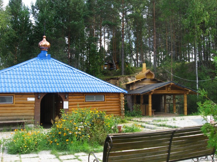 Мстёра. Источник в Акиньшино, здание Купальни (слева) и постройка над Родником, август 2016 г.