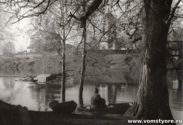Рыбак на фоне плавающего мостика на Мстёрке. Из архива Б.М.Вифлеемского