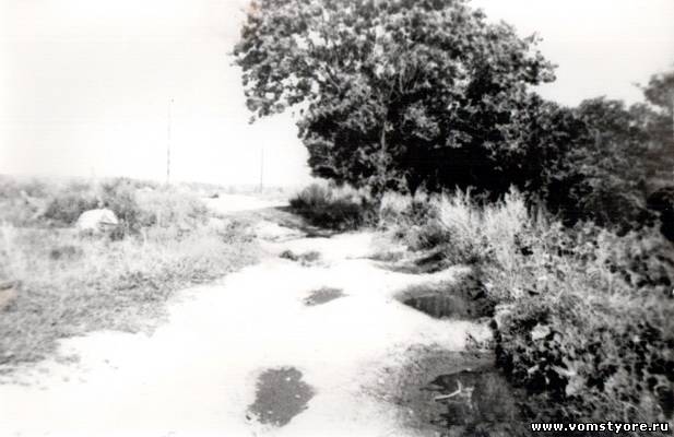 Фото "Улица моего детства"Прямо перед палисадником, почти посредине улицы, расположен был пруд. Он наполнялся весенними водами, стекавшими с усадьбы, расположенной за домом наших соседей, Угловых. Между нашими участками был небольшой овражек, который заканчивался далеко за усадьбами. Похоже, он был рукотворный, сделанный для отвода вод, чтоб не заболачивались участки. Место, где находился родительский дом, угадывалось только по развалинам дома соседей Борисовых. В этом доме жили родственники Героя Советского Союза лётчика Борисова. Дом состоял из двух половин, в одной половине жили родители с дочерью, в другой половине жил брат с женой и дочерью, ровесницей моей сестры Веры.Автор текста и фото Чекалов Е.В. 1988 г.