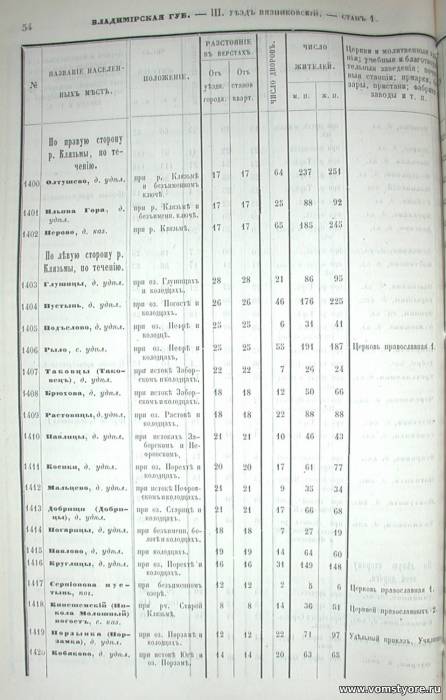 Списки Населённых Мест на 1863 г. Стр. 54. Вязниковский уезд, стан 1. Под номером 1408 - д. Брюхова, удел., при истоке Заборском и колодцах, 12 дворов при 116 жителях.