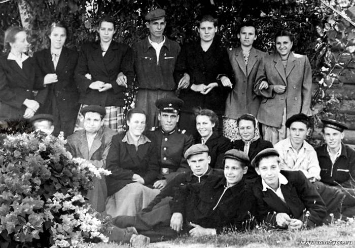 Двоюродная сестра моего отца Людмила Петровна Дельнова (Дубкова) с молодыми коровашевцами. Коровашево. Конец 50-х годов. В центре в сержантской форме - Анатолий Жильцов. Конец 50-х годов.
