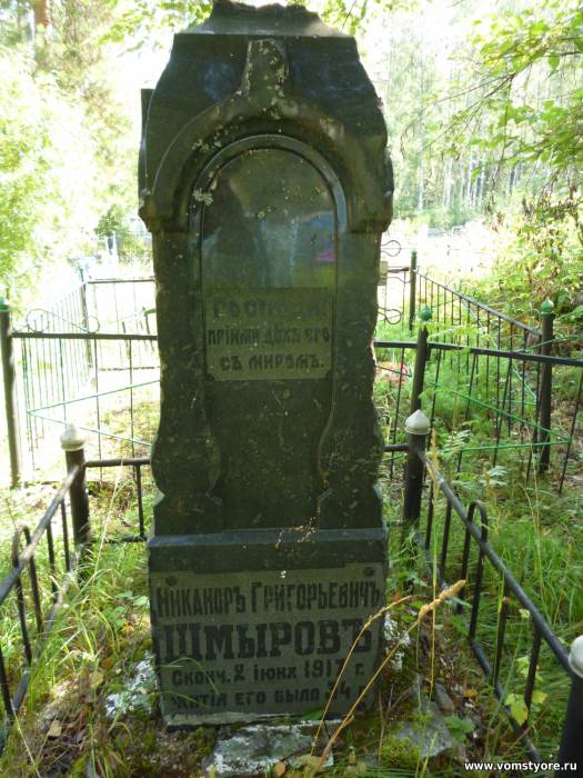 Единственная восстановленная на "Кладбище д. Комары" бывшего Пузовского прихода - дореволюционная могила 1917 г. с дорогим сохранившимся надгробием из чёрного мрамора, похоже клейма мастера "Кабановъ. Москва. Мясницкая." Покоится под ним - Шмыров Никанор Григорьевич (1883-1917 гг) с д. Большевысоково. Есть сведения, что братья Шмыровы были основателями льно-ткацкого производства в Большевысоково. Также есть и данные о репрессированных в 1930 г. крестьянах с. Сергие-Пузо - родных братьях: Шмыровых Никите Даниловиче, 1879 г.р. и Василие Даниловиче, 1885 г.р. , уроженцах и проживавших в с. Сергие-Пузо Вязниковского р-на. Арестованы они были в один и тот же день - 06.11.1930 г. и осуждены Советской властью на 3 г. лишения свободы. (Данные из книги "БОЛЬ И ПАМЯТЬ". Том I, список репрессированных по Вязниковскому р-ну Владимирской обл.).