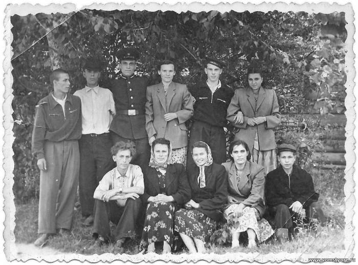 Молодые коровашевцы в деревне. В сержантской форме - Анатолий Жильцов. Коровашево, конец 50-х годов.
