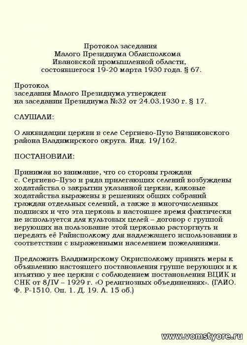 Протокол заседания Малого Президиума Облисполкома Ивановской промышленной области, состоявшегося 19-20 марта 1930 года. § 67. Был вскоре утверждён на заседании того же Президиума № 32 от 24.03.1930 г. § 17. "О ликвидации церкви в селе Сергиево-Пузо Вязниковского района Владимирского округа.