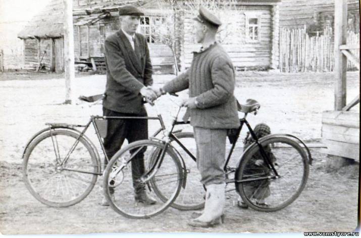 д.Семынь.Иван Степанович Бородин (слева),Норкин Николай Иванович напротив колхозной конторы.Справа виден угол деревенского магазина.1950-е