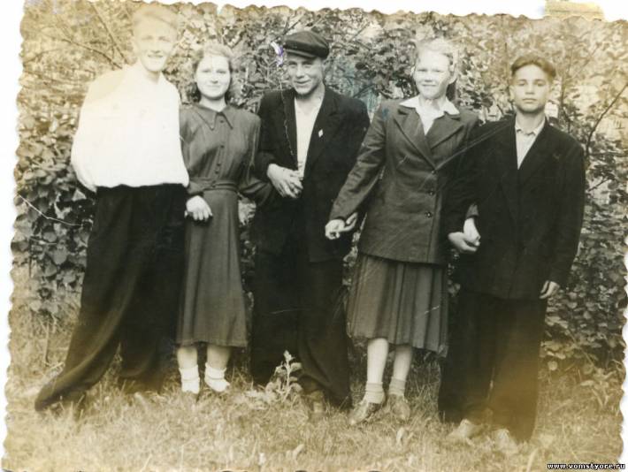 д.Свиново 1955 г. Слева: Владимир Степанович Кренделев,девушка неизвестна,Анатолий Иванович Фарафонов,Зинаида Геннадьевна Кренделева,Смирнов Александр Сергеевич