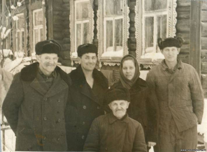 д.Свиново.Дом Кренделевых .Слева Гавриил Фёдорович Кренделев из Крестниково,Кренделев Иван Фёдорович,Фарафонова Анна Ивановна,Александр Брюханов.Сидит Кренделев Фёдор Епифанович 1950 г.