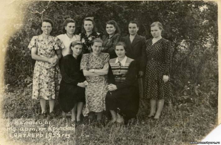 д.Яблонцы. Отделение артели им.Крупской.1954 год. Вверху слева направо:Мария Корочкина,Фарафонова Людмила Сергеевна,Надежда,Фарафонова,Людмила Волкова.Внизу слева направо:Чекушина Клавдия,Валентина Постникова,Вера Новикова.
