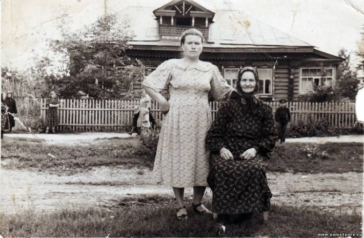 Смирновы Мария Алексеевна (сидит; урожд. Тараканова) и Нина Ивановна (стоит; урожд. Постникова, сноха М.А.). На заднем плане дом Смирновых. Деревня Зубариха. 1960-е гг.