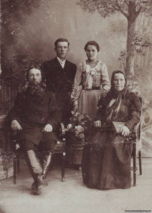 Семья Смирновых (сидит слева Смирнов Федулай Гаврилович, справа – его жена). Нач. ХХ в. Фотография И.И.Щадрина. Смирновы – крестьяне д. Зубариха.