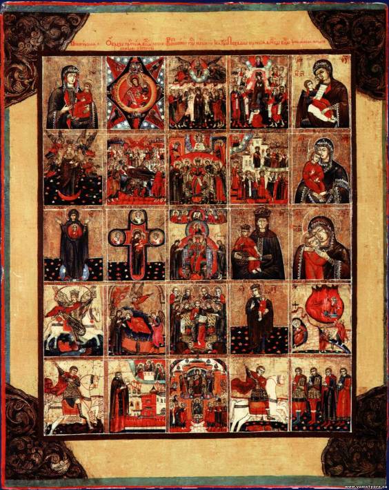 Многочастная икона. 25 клейм. 19 век. Мстёра. Дерево кипарис, левкас, темпера. 54,5х43,9 см.