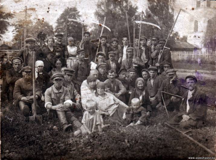 Барское Татарово. Группа косцов на фоне Покровской церкви. 1930-е гг.