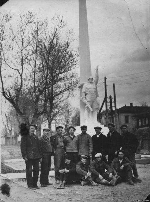 Строители памятника войну освободителю во Мстёре. 9 мая 1966 год. При строительстве в основание памятника была заложена бутылка водки.