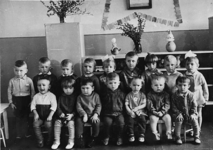 Это мы: Кресов Саша, Миша Евдокимов, Юра Черепенин, Саша Бородин, Галя Рачкова, Юра Мочалов, Валя Зайцева, Вова Папушников, Оля Белова. В нижнем ряду дети из младшей группы.