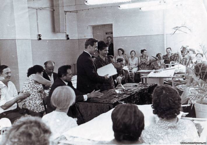 Встреча с космонавтом В.Кубасовым на фабрике им. Крупской. Мстёра. 1970-е гг. Рядом с Кубасовым директор фабрики Звонкина Лидия Николаевна.