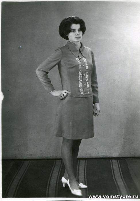 Работница Мстёрской строчевышивальной фабрикаи им.Н.К.Крупской демонстрирует образец выпускаемой продукции. Фото из частного архива.