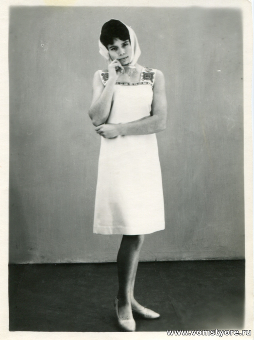Работница Мстёрской строчевышивальной фабрикаи им.Н.К.Крупской демонстрирует образец выпускаемой продукции. Фото из частного архива.