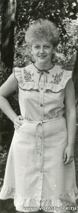 Работница Мстёрской строчевышивальной фабрикаи им.Н.К.Крупской демонстрирует образец выпускаемой продукции. Фото из частного архива.