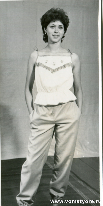 Работница Мстёрской строчевышивальной фабрикаи им.Н.К.Крупской демонстрирует образец выпускаемой продукции. Фото из частного архива.