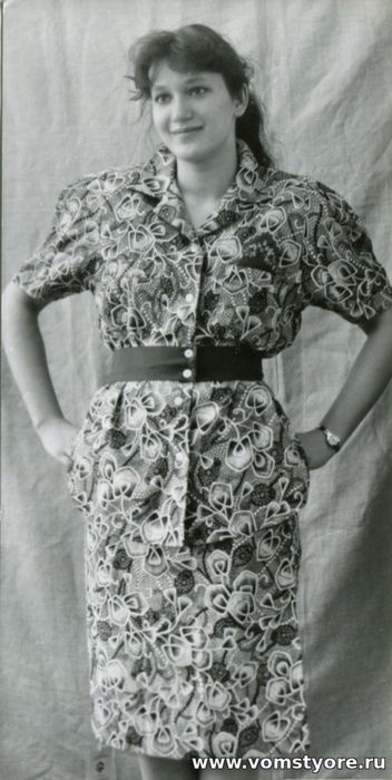 Работница Мстёрской строчевышивальной фабрикаи им.Н.К.Крупской демонстрирует образец выпускаемой продукции. Фото из частного архива.