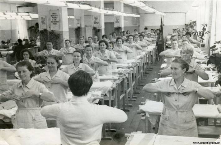 Это фото - начала 70-х годов. Вышивальный цех. В среднем ряду третья - это моя мама Фарафонова Надежда Степановна. Физкультминутки в цеху проводились регулярно, чтобы ноги-руки не затекали. На фабрике была штатная должность физкультурника.