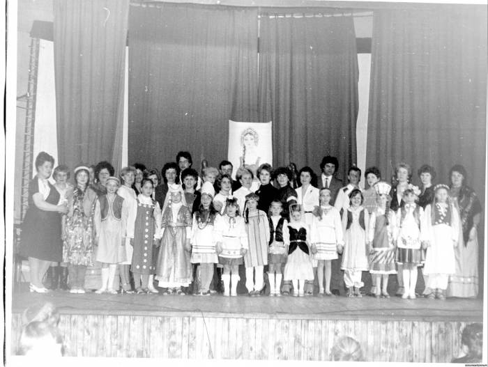 Клуб фабрики им.Дзержинского Ф.Э. ( Белый клуб).Смотр художественной самодеятельности.На сцене представители мстёрской швейной фабрики 1985г.