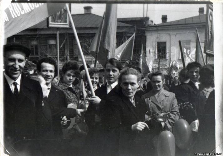 Первомайская демонстрация во Мстёре.Колонна рабочих фабрики им.Дзержинского.1960-е годы.