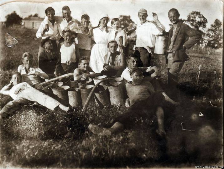 Мстёра. Пришкольный сад (сейчас – Мстёрский ЦВР им. И.А.Альбицкого). Группа школьников с учителем Иваном Алексеевичем Альбицким (стоит справа) после поливки питомника. Лето 1939 года.