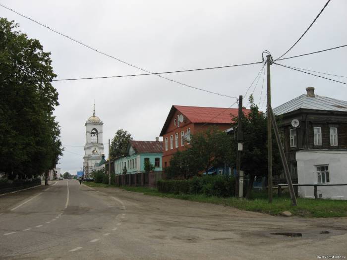 Мстёра. 1-й Набережный переулок начинается на перекрёстке площади Ленина и улицы Братьев Сусловых. Вид с перекрёстка на Площадь, август 2016 г.