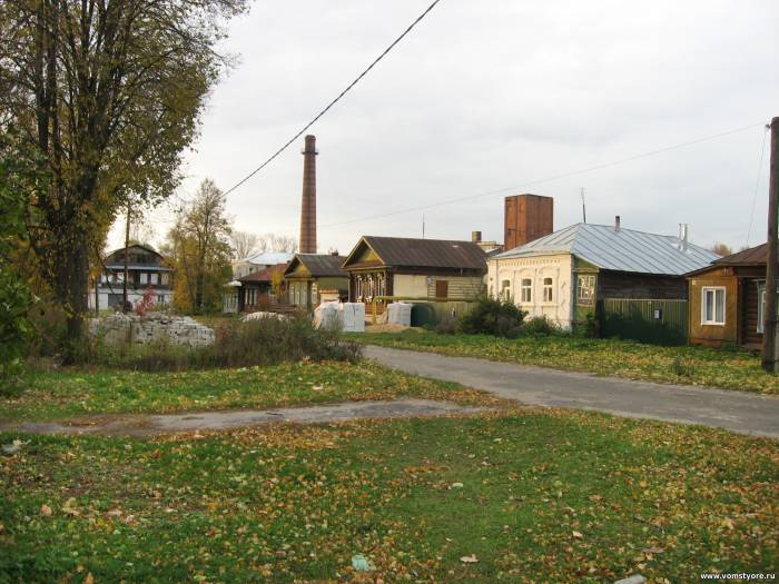 Вид в тупик улицы Братьев Сусловых со стороны переулка Братьев Сусловых, 2014 г. Труба - фабрика Мстёрская клеёнка. Белый домик - Дом 12, слева от него Дом 14.