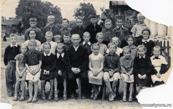 Учитель Александр Петрович Крестьянинов. Он был и моим первым учителем. Замечательный человек, доброй души и большого терпения. Он был единственным мужчиной - учителем начальных классов. Мы очень им гордились. На фото НЕ наш класс, более ранний выпуск.